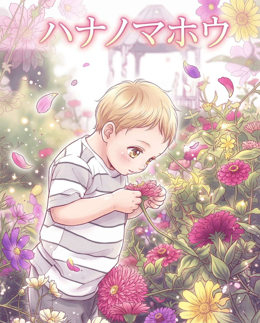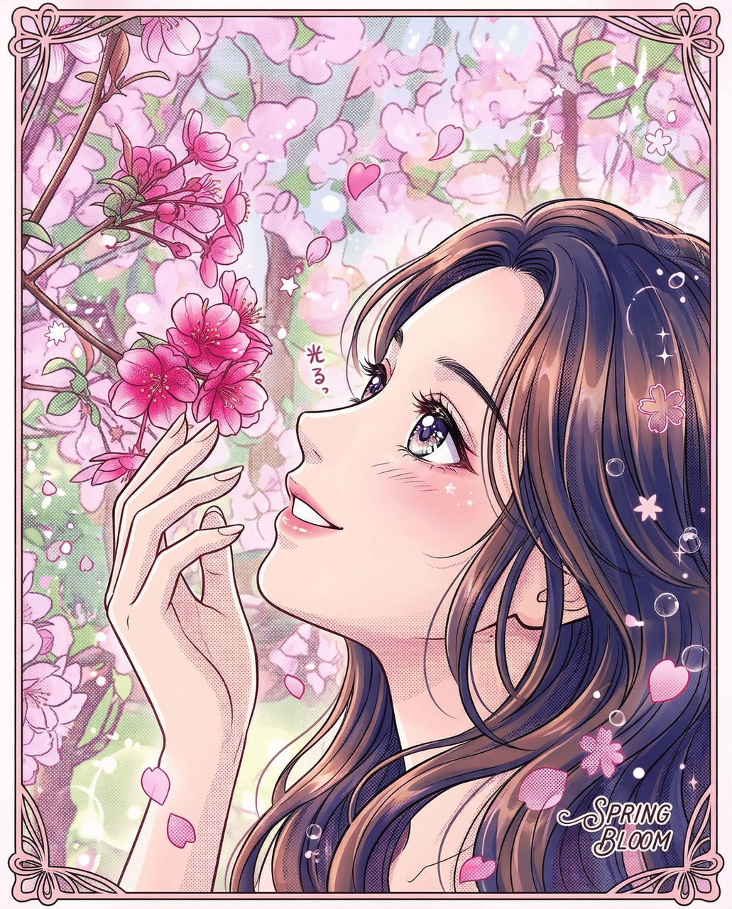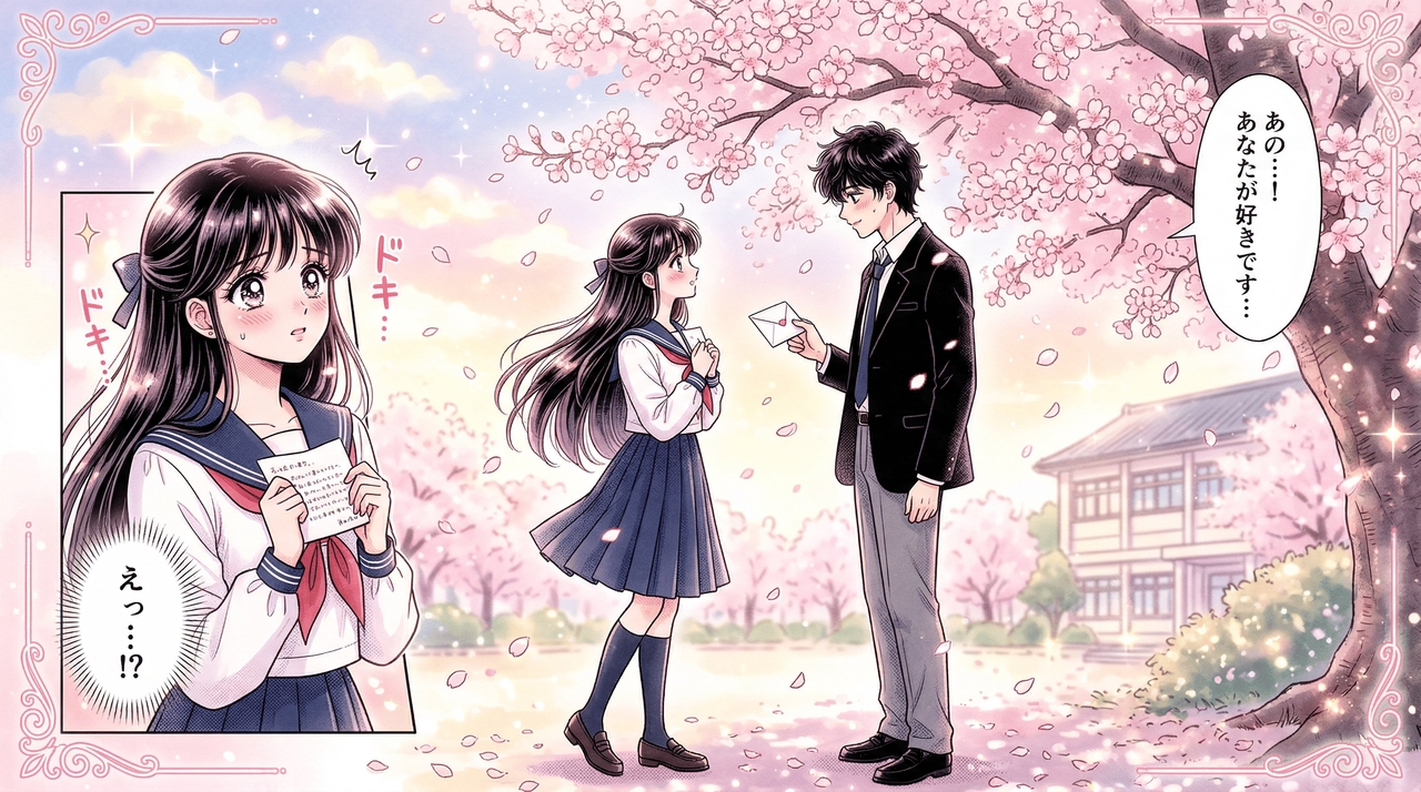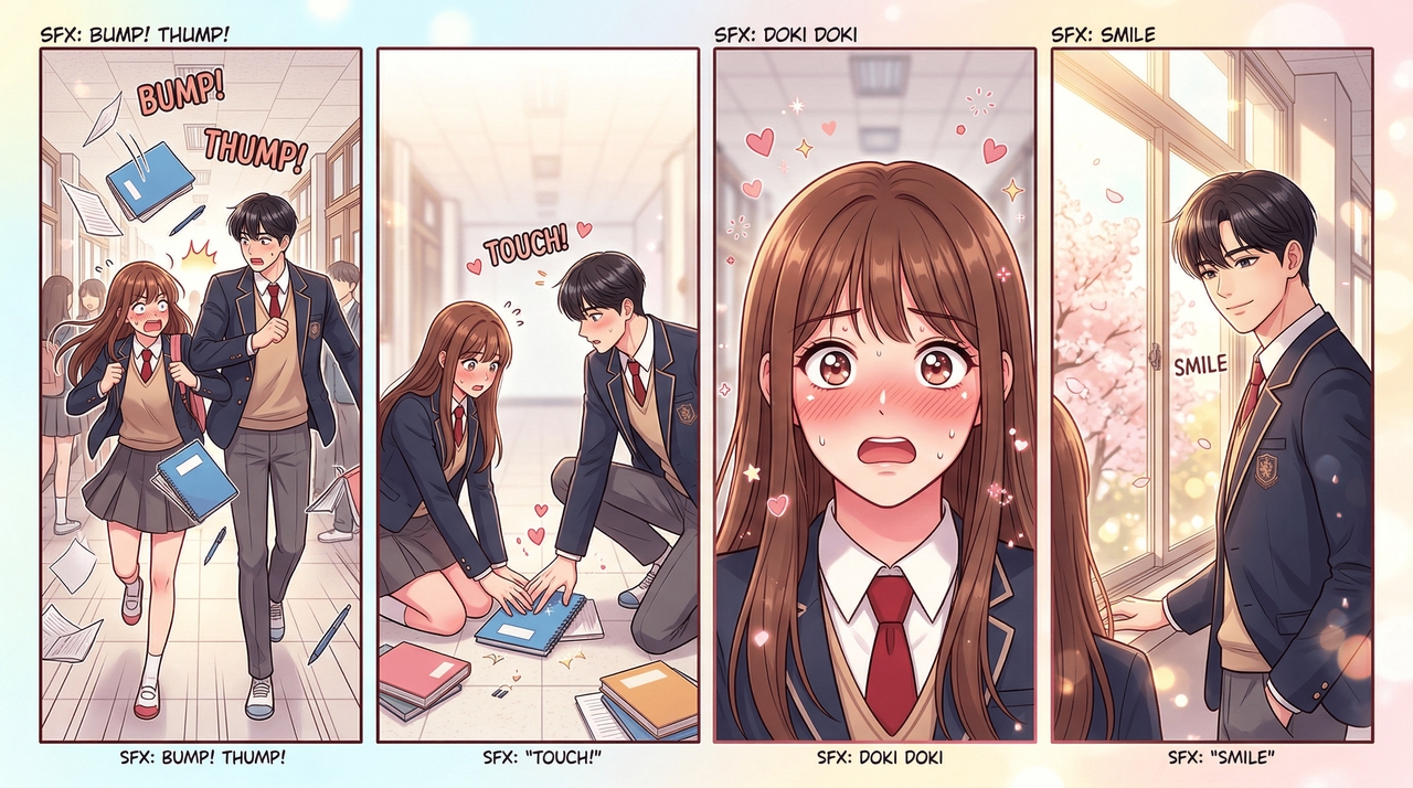 Prompt: Create a 4-frame full-color webtoon strip. Frame 1: A clumsy schoolgirl bumping into a tall, handsome transfer student in the hallway, dropping her books. Frame 2: They both reach down to pick up the books, their hands accidentally touching. Frame 3: A close-up of the girl blushing furiously. Frame 4: The boy smiles gently as cherry blossoms blow past the window.