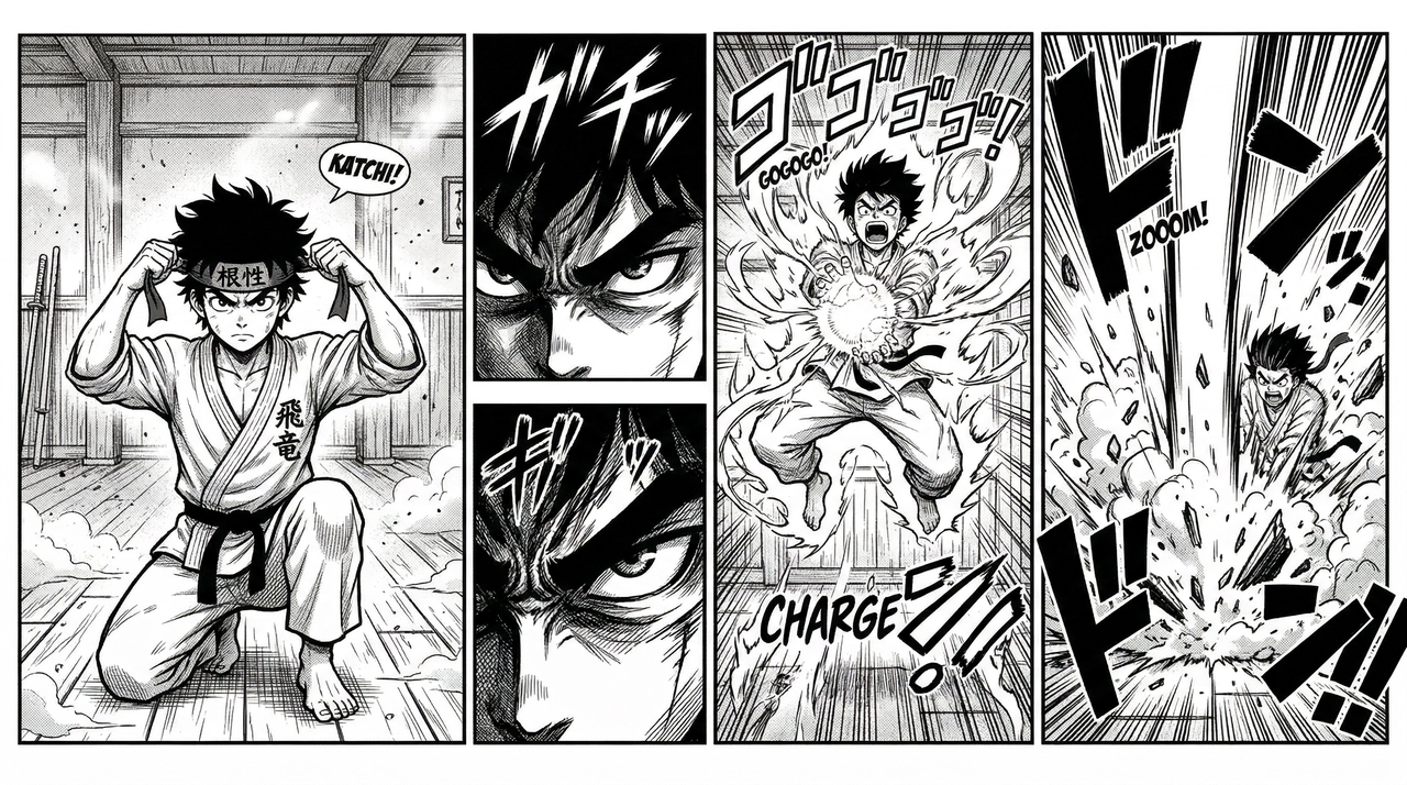 Prompt: Generate a 4-frame black and white manga sequence. Frame 1: A determined young martial artist tying his headband in a dusty dojo. Frame 2: A close-up of his intense, glaring eyes. Frame 3: He leaps into the air, charging a powerful energy attack. Frame 4: A massive explosion of dust and debris as the attack hits the ground.