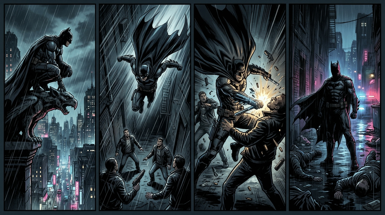 Prompt: Produce a 4-frame dark, cinematic superhero comic sequence. Frame 1: A masked vigilante crouching on a rain-slicked gargoyle overlooking a neon-lit city. Frame 2: He dives down towards a group of armed thugs in a dark alley. Frame 3: A dynamic action shot of him disarming a thug with a specialized gadget. Frame 4: The vigilante standing victorious in the shadows as police sirens approach.
