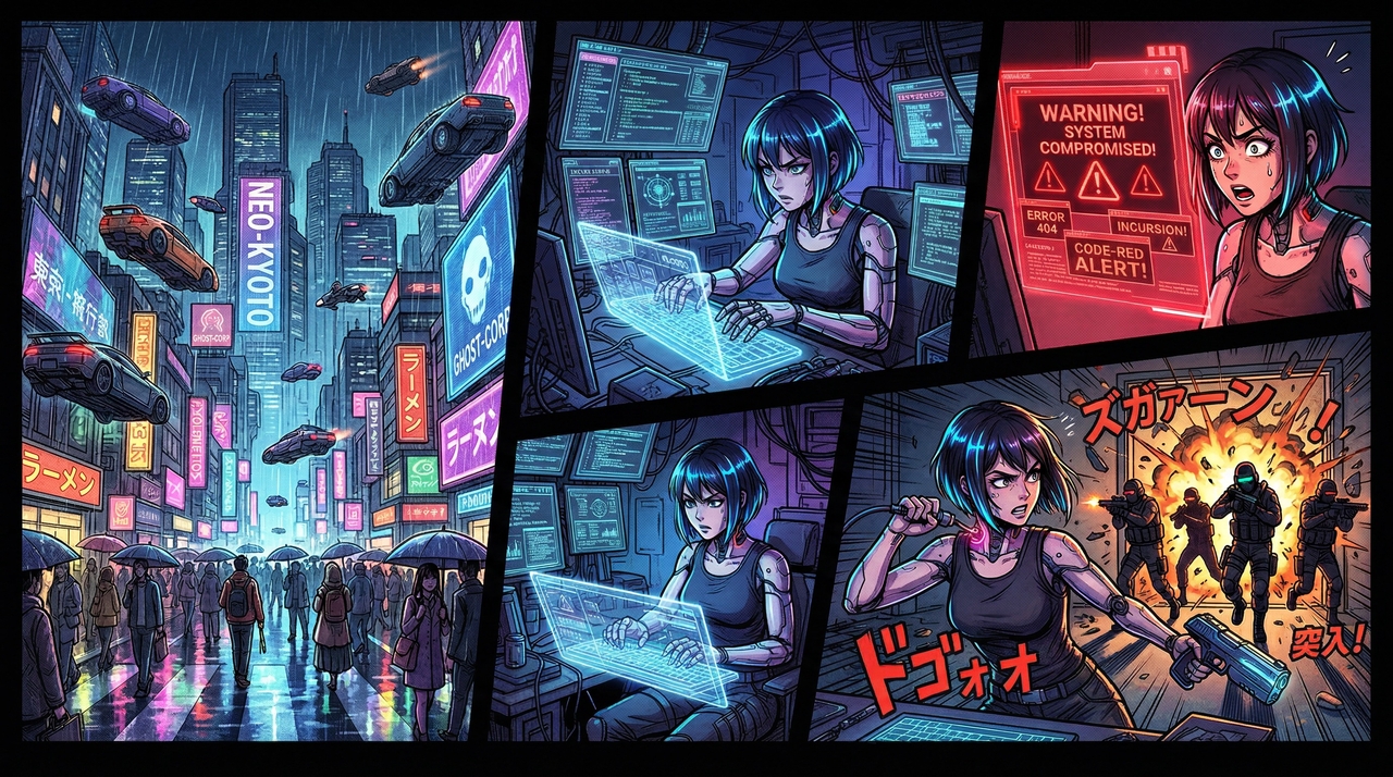 Prompt: Design a 4-frame cyberpunk manga sequence. Frame 1: A wide shot of a bustling futuristic street filled with flying cars and holographic advertisements. Frame 2: A female cyborg hacker typing rapidly on a glowing virtual keyboard. Frame 3: A sudden warning flashes on her screen, illuminating her face in red light. Frame 4: She unplugs quickly, grabbing her futuristic blaster as the door bursts open.