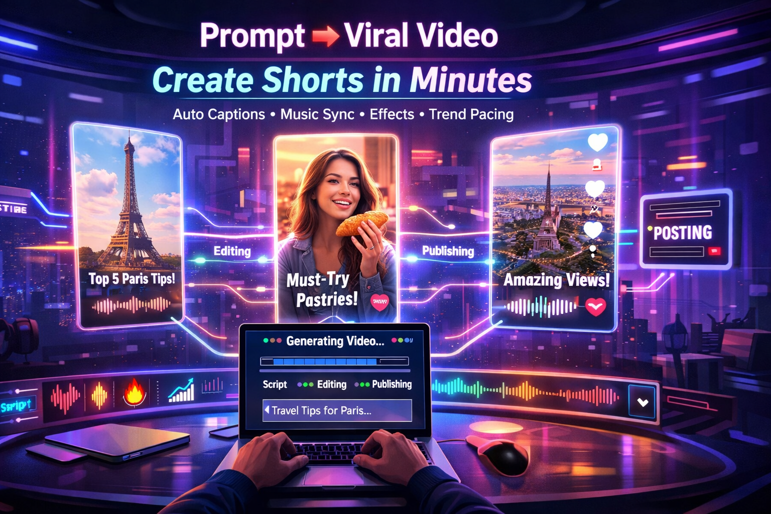 Turn ideas, scripts, or images into stunning 9:16 shorts in seconds using trending effects, AI voiceovers, music sync, and dynamic motions.