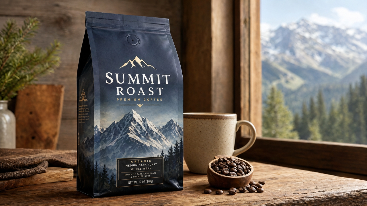"A professional product photo of a premium coffee bag labeled 'Summit Roast' with mountain artwork, placed on a rustic wooden table with natural window light, sharp details, 4K."