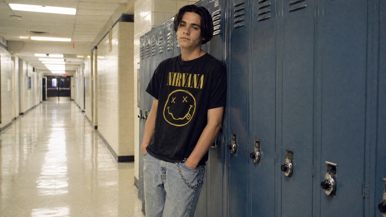 "A photorealistic 35mm film photograph of a teenage boy leaning against blue school lockers, wearing a black Nirvana t-shirt with smiley logo and light wash jeans, natural fluorescent lighting, 1990s aesthetic."