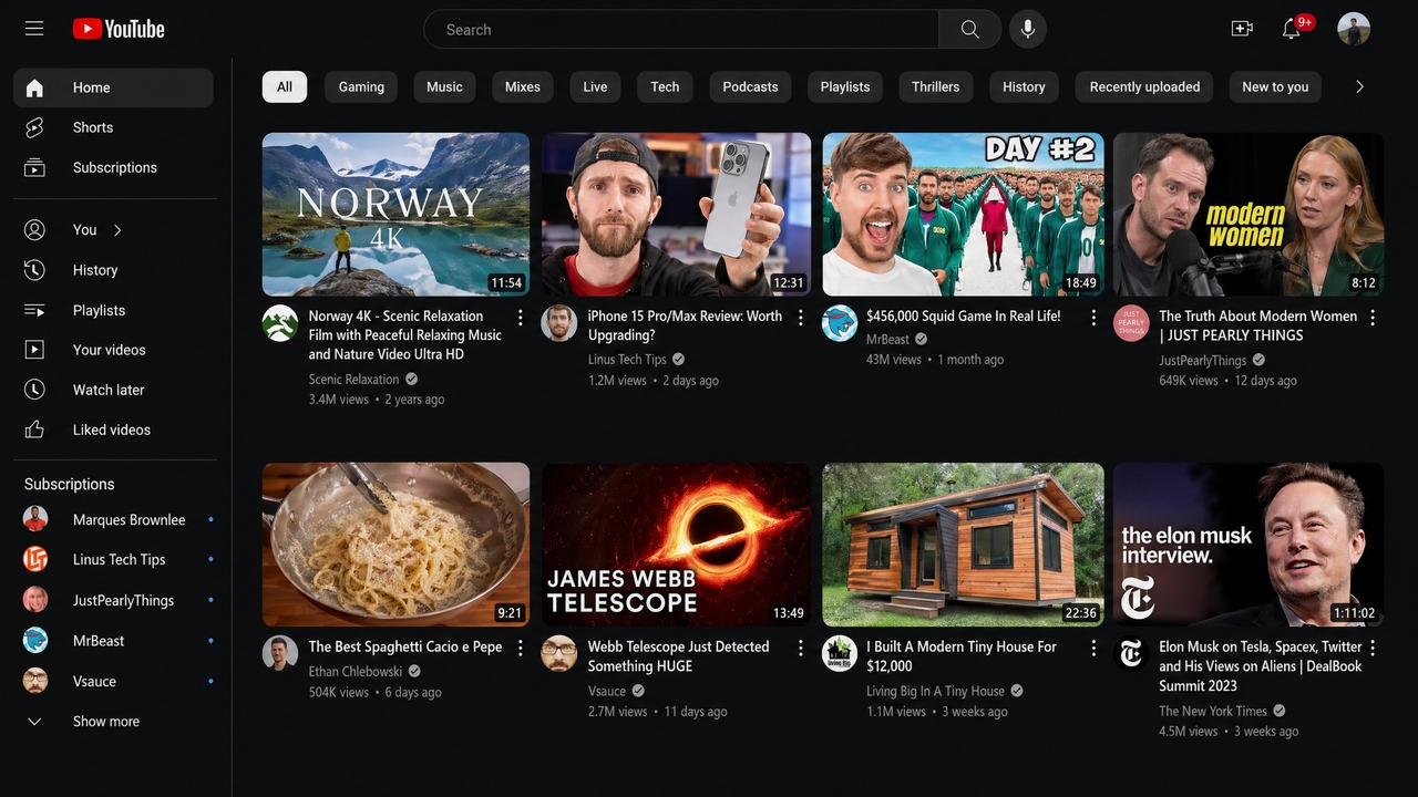 "A pixel-perfect recreation of the YouTube homepage UI with sidebar navigation, search bar, category chips, and realistic video thumbnails with titles, view counts, and durations."