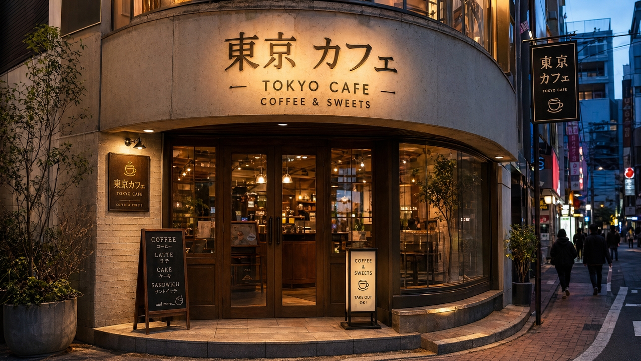 "Multilingual storefront signage for a cafe in Tokyo, featuring Japanese and English text on curved surfaces, warm evening lighting, photorealistic details."