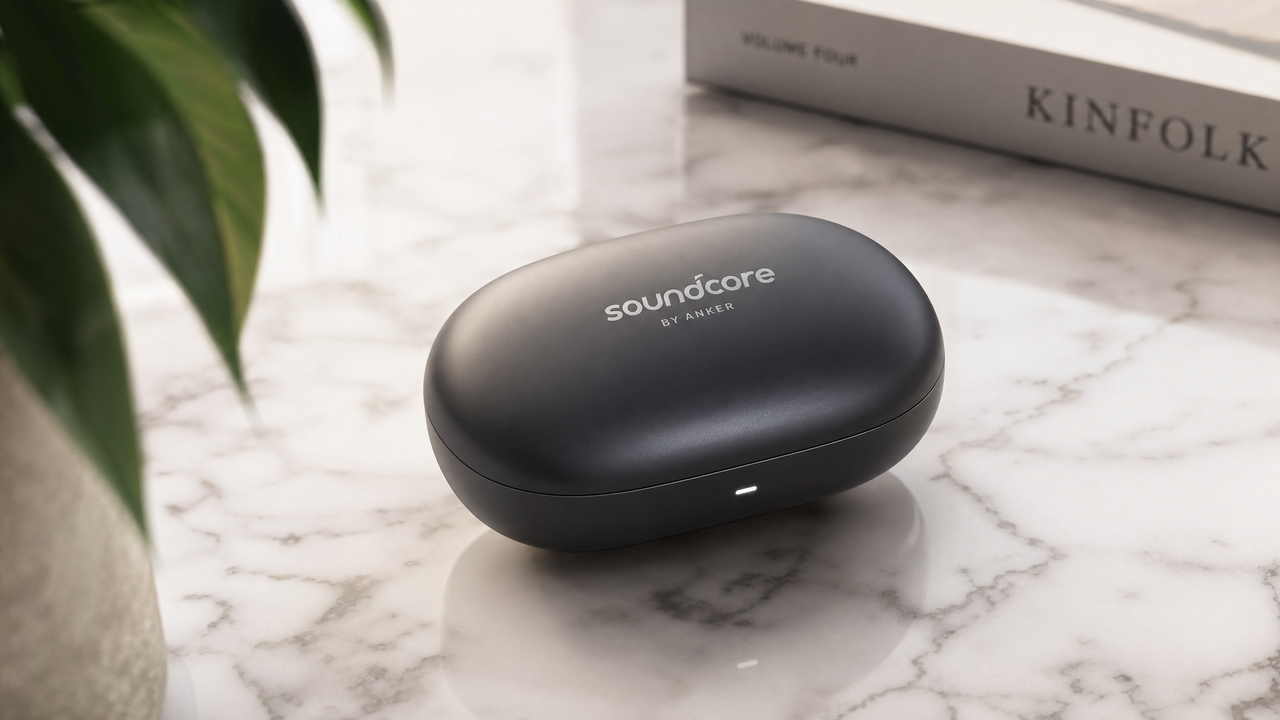"Cinematic product shot of a modern wireless earbuds case on a marble surface with accurate branding text, soft shadows, and studio-quality reflections."