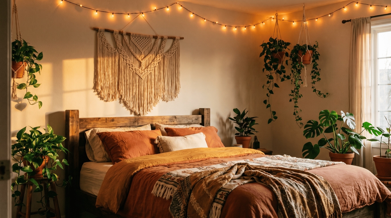 Focus on specialized individual spaces, experimenting with unique layouts, color palettes, and decor elements to maximize utility and style. Prompt: "A cozy bohemian bedroom setup with fairy lights, a macrame wall hanging, a wooden bed frame, and lush green indoor plants, cinematic lighting."