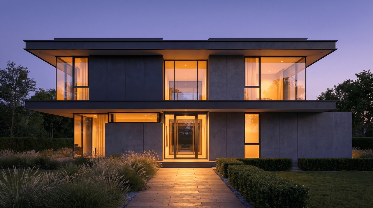 Conceptualize stunning architectural exteriors and overall house structures, blending different materials and styles to envision the perfect property. Prompt: "A sleek contemporary two-story house exterior at twilight, featuring large glass panels, dark steel accents, and a warmly lit front pathway, architectural rendering."