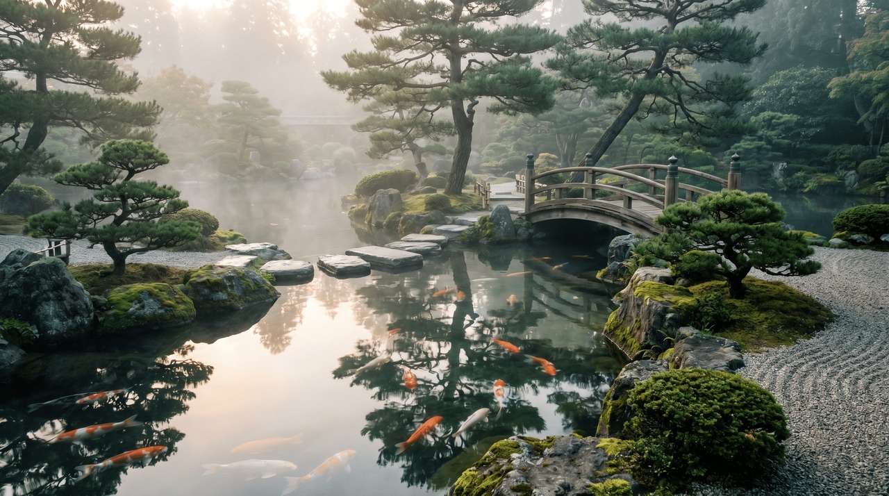 Plan beautiful outdoor environments, combining lush flora, hardscaping elements, and atmospheric conditions to create serene natural retreats. Prompt: "A serene Japanese zen garden featuring a koi pond, stepping stones, carefully pruned bonsai trees, and a small wooden bridge, soft morning mist."