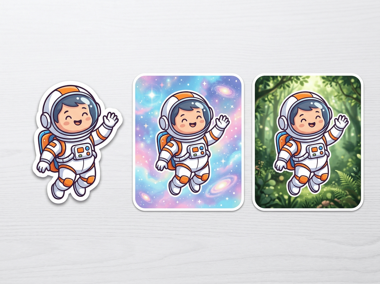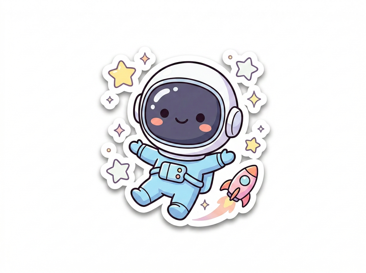 A chibi astronaut floating in space with stars and a tiny rocket, big head, small body proportions, cute anime look, bold outlines, sticker.