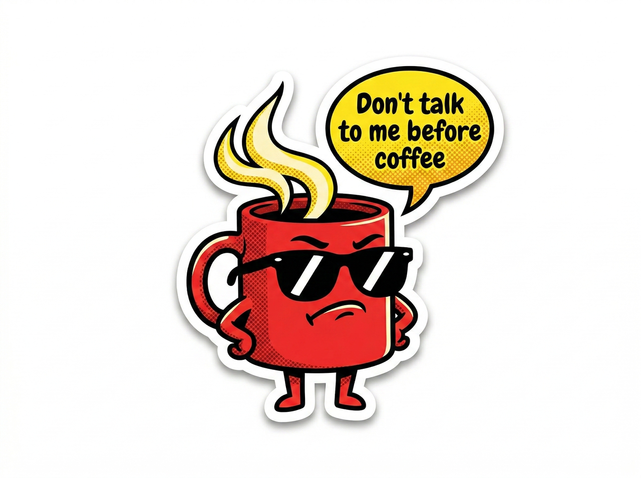 A snarky coffee cup wearing sunglasses saying 'Don't talk to me before coffee,' bold comic style, thick outlines, bright flat colors, sticker.