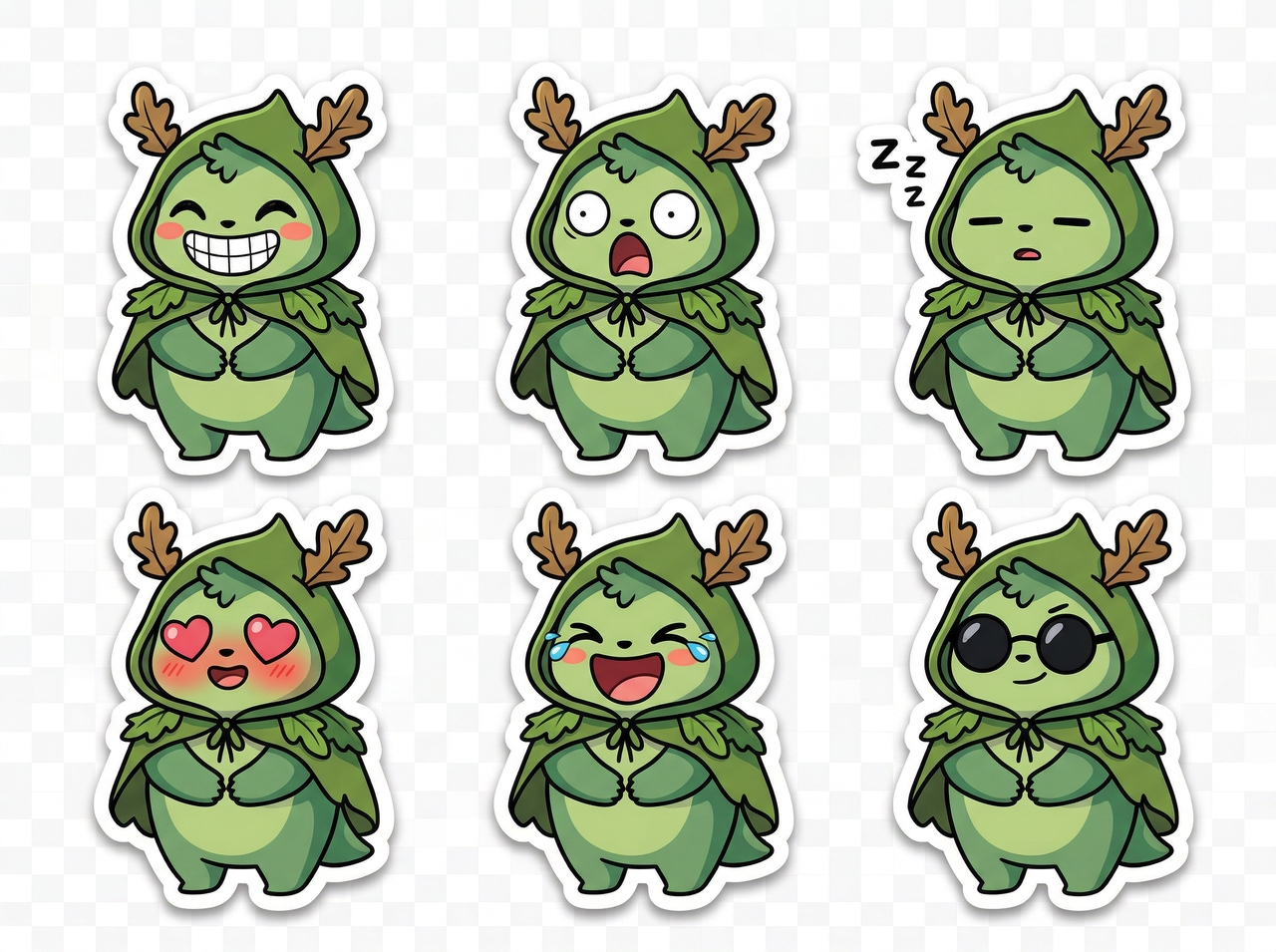 A set of 6 expressive faces that include happy, shocked, sleepy, in love, laughing, and cool. Each should have a bold cartoon style, clean outlines, and a transparent background sticker pack.