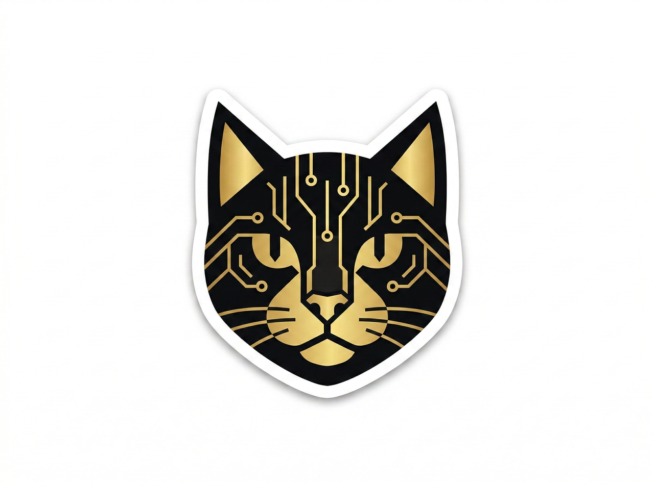 A minimal AI cat face logo, flat design, black and gold color palette, sharp, clean edges, and vector-style branding sticker.