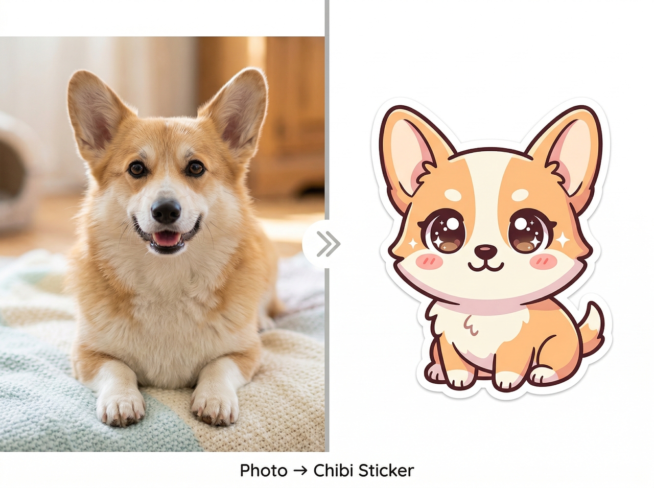 Convert this corgi photo into a chibi-style sticker with exaggerated cute features, big eyes, small body proportions, soft colors, and a clean transparent background.