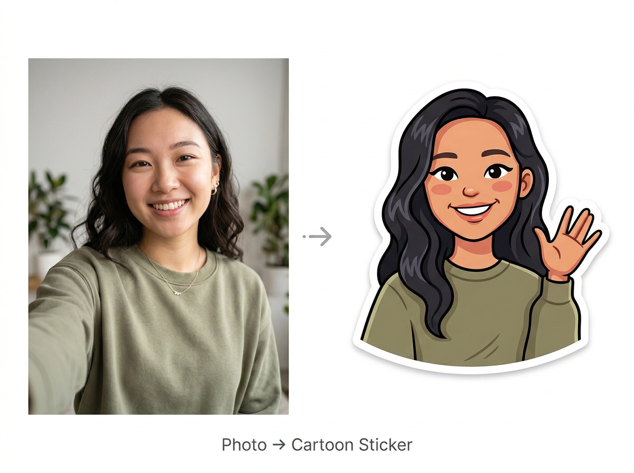 Turn this selfie into a cartoon avatar sticker with bold outlines, smooth colors, expressive face details, and a transparent background for messaging apps.