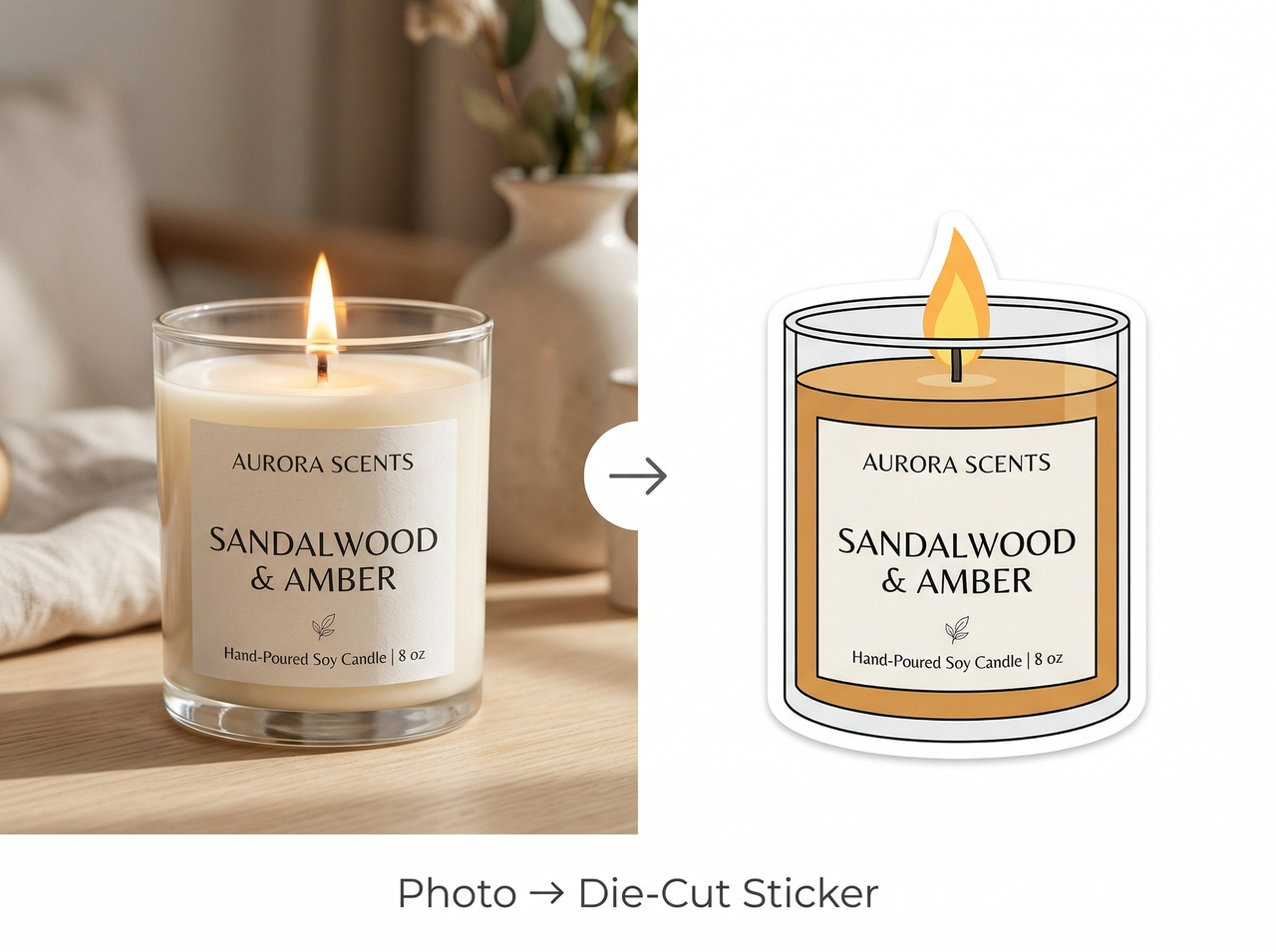 Transform this candle jar photo into a clean die-cut label sticker with sharp edges, minimal background, clear product focus, and print-ready transparent background.